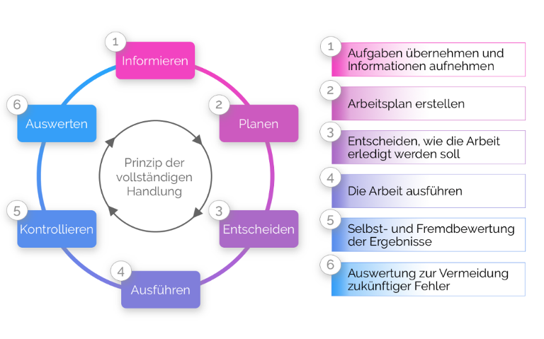 Um die genannten Anwendungsbereiche in Bezug auf ihre Eignung für Weiterbildung, Training und Ausbildung zu bewerten, haben wir als Kriterium das „Prinzip der vollständigen Handlung“ herangezogen, das sechs Handlungsdimensionen definiert: