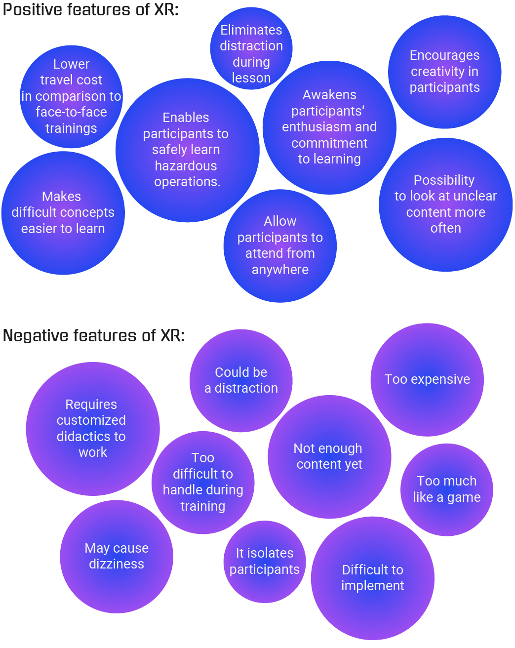 Durch die Befragung konnten sowohl vorteilhafte als auch potentiell schädlich Eigenschaften von XR-Anwendungen identifiziert werden. Hier ein Überblick:
